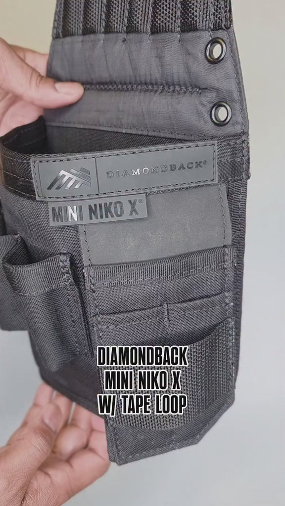 The Mini Niko X takes everything you love about the original Mini Niko and makes it smarter, tougher, and more versatile. A redesigned, removable tape loop, long bit storage, and an extra D-ring expand your options on the job. The 5-slot bit index keeps essentials organized, while DX9 Tech fabric on the back reduces abrasion against your pants or leg. With dedicated storage for drivers, lineman pliers, and cutters, plus an open main pocket with divider for testers, connectors, or fasteners, the Mini Niko X is built to increase efficiency and keep your everyday carry organized.
