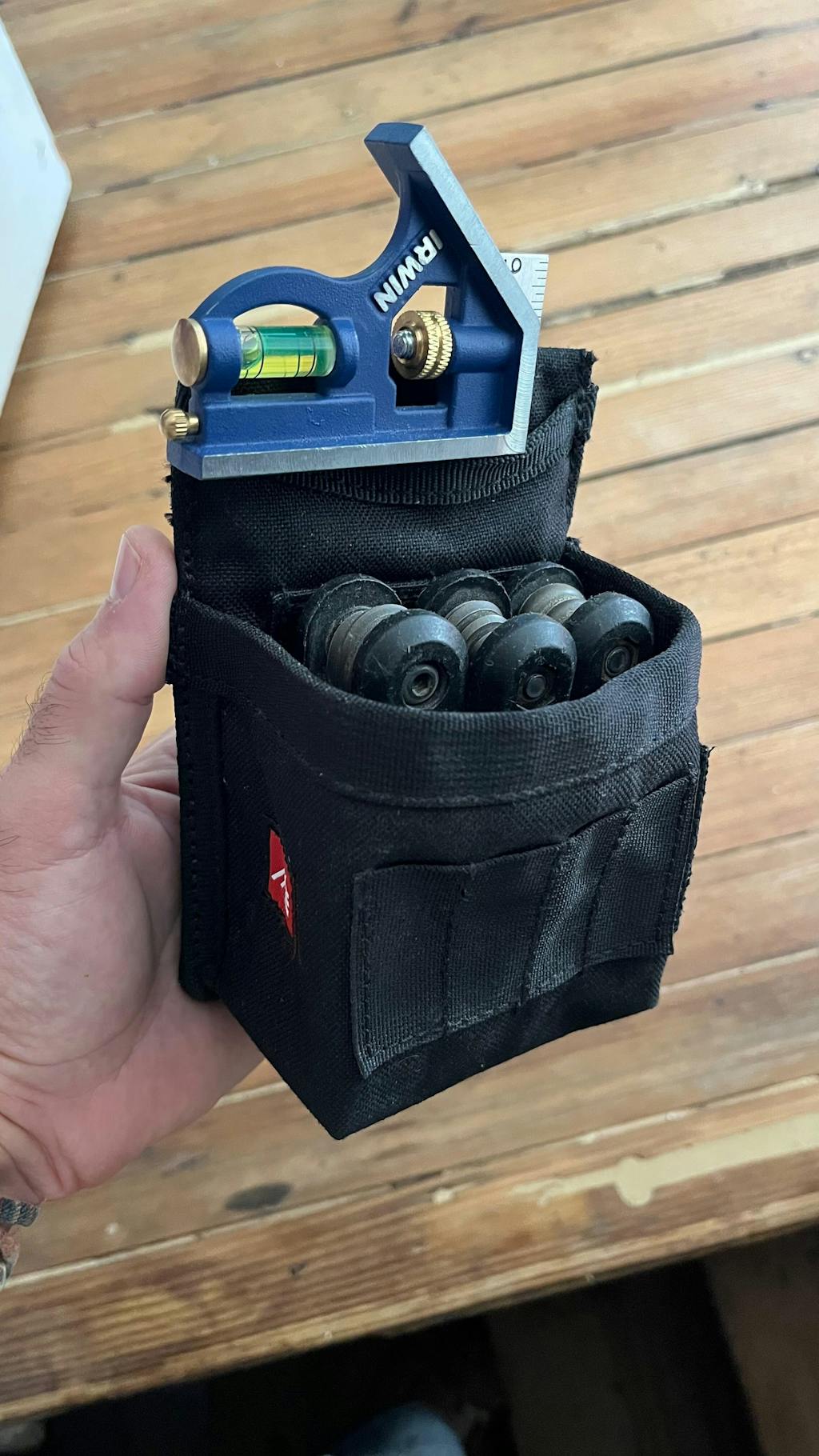 - Open pouch sized for fasteners, small glue bottle, or 35’ tape