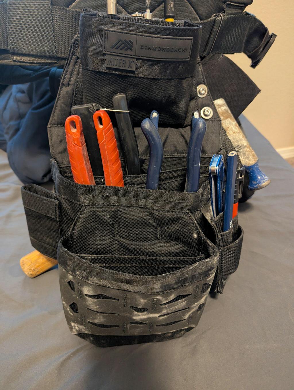 The Miter X is the perfect mid-sized dominant side pouch. Not too small and not too large, it features a generously sized main pocket with a slim profile to maximize storage without making you feel bulky. Six large tool slots in the main pocket are sized to fit most any size hand tool. The outer pocket features a divider for trim square, a 6-slot bit index for multiple length bits and an outer Hypalock grid for easy modular expansion.