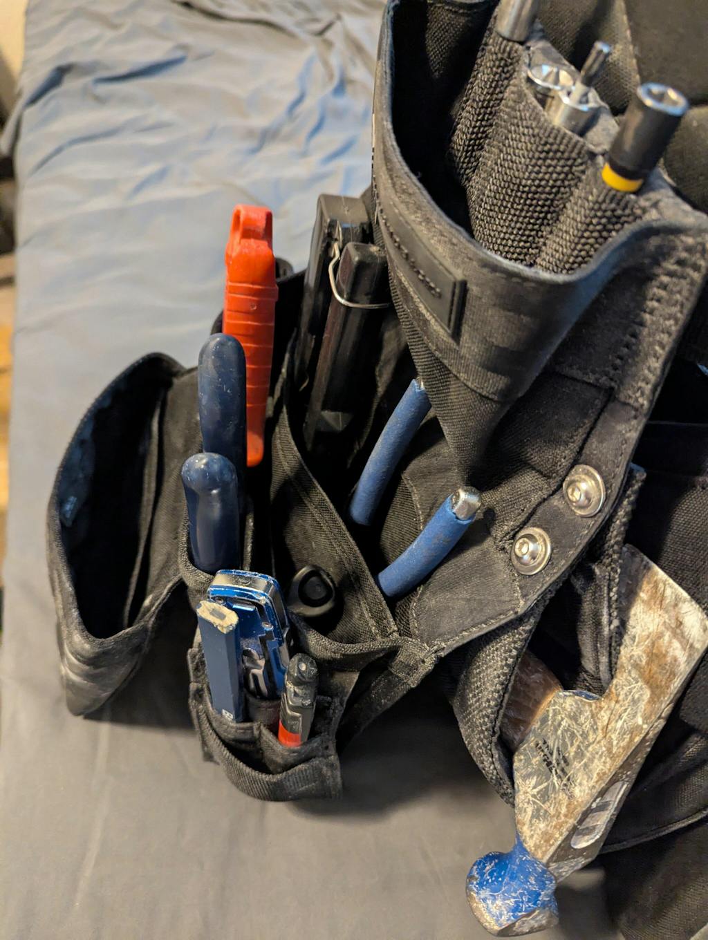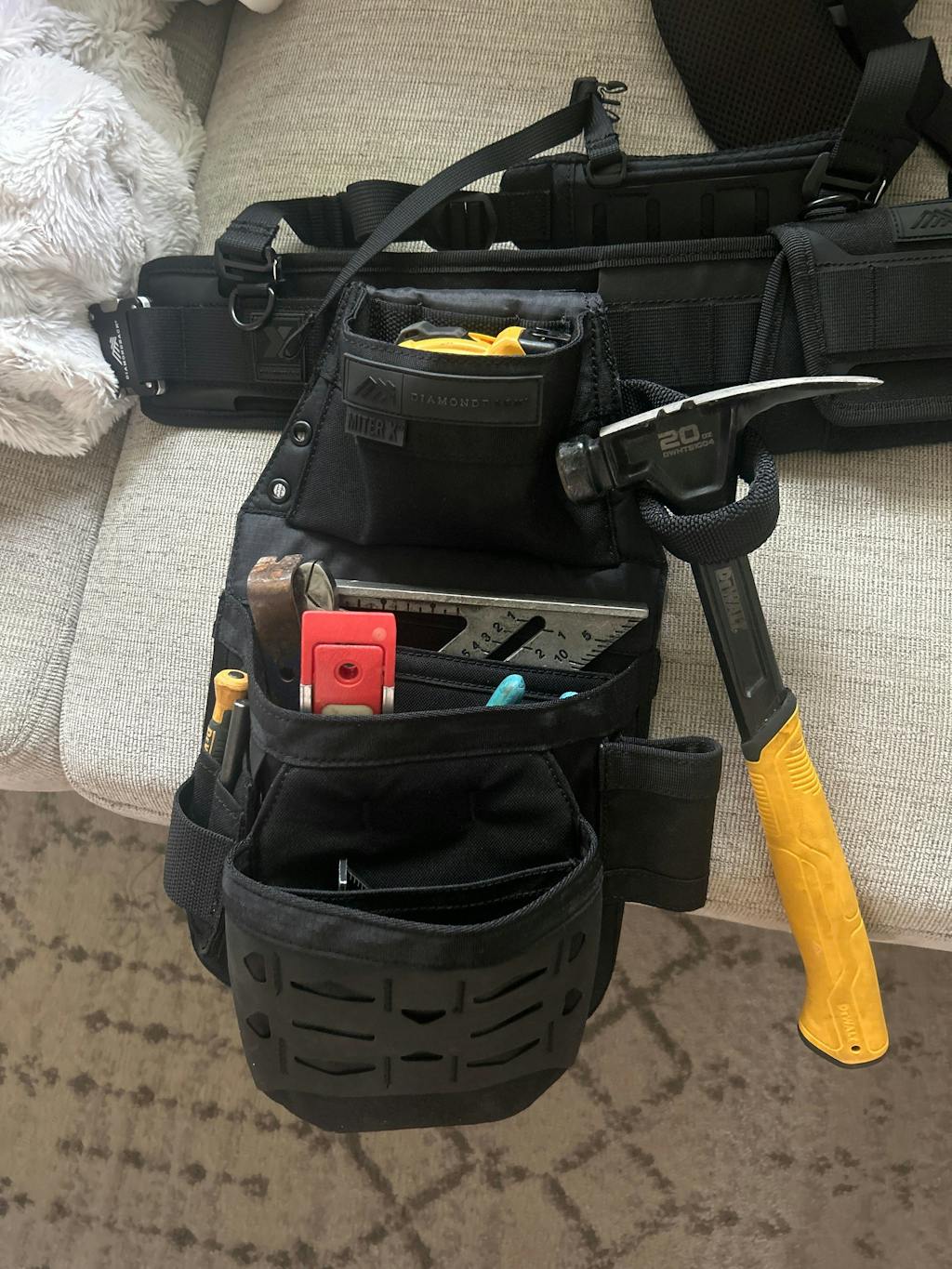 The upper pocket is large enough for 35’ tape. Rear carry hammer loop, outer tool loop for prybar or cat’s paw, and outer utility pocket with stiff webbing attachment round out the organizational features. Attach a tool tether, tape loop or store miter clamps on the integrated d-ring tucked beneath the utility pocket. DX9 Tech Fabric on the back won’t cause unwanted abrasion to your pants or legs.