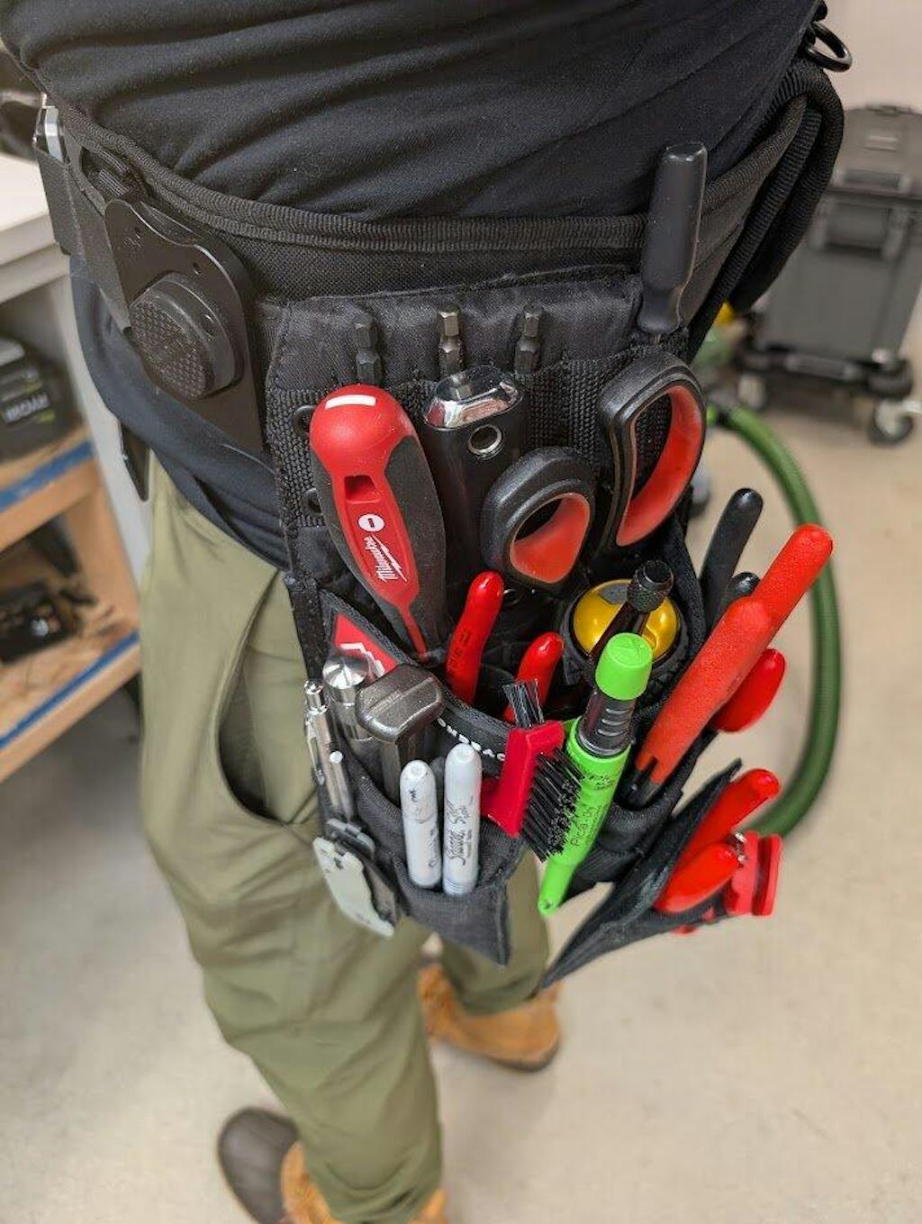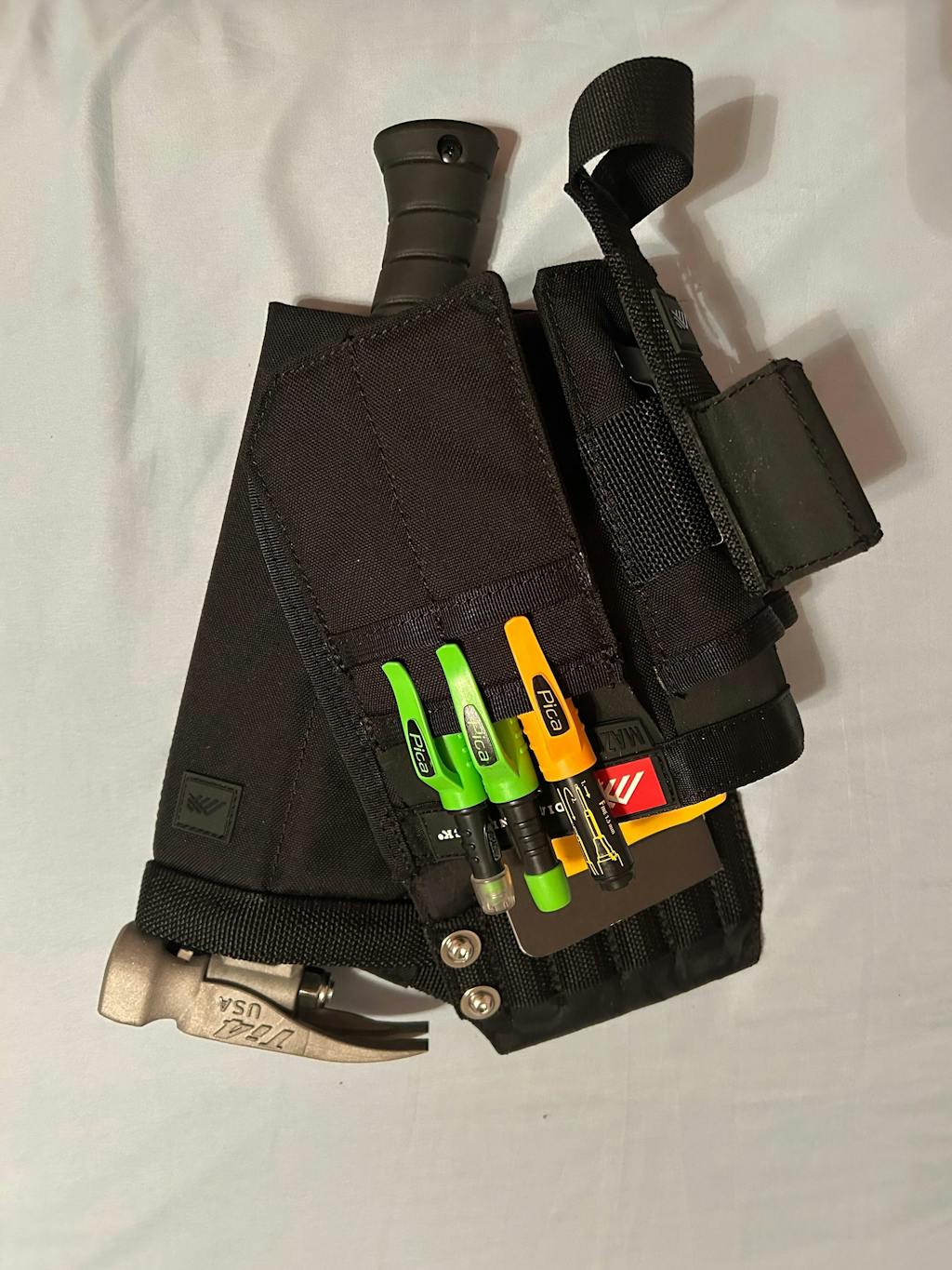 Fits a lot of tools without feeling bulky. Big improvement over the original Mazo is the organizers / dividers in the main pocket. Now I can slip in a scraper, scissors, screwdriver, wrench, they each get their dedicated spot.