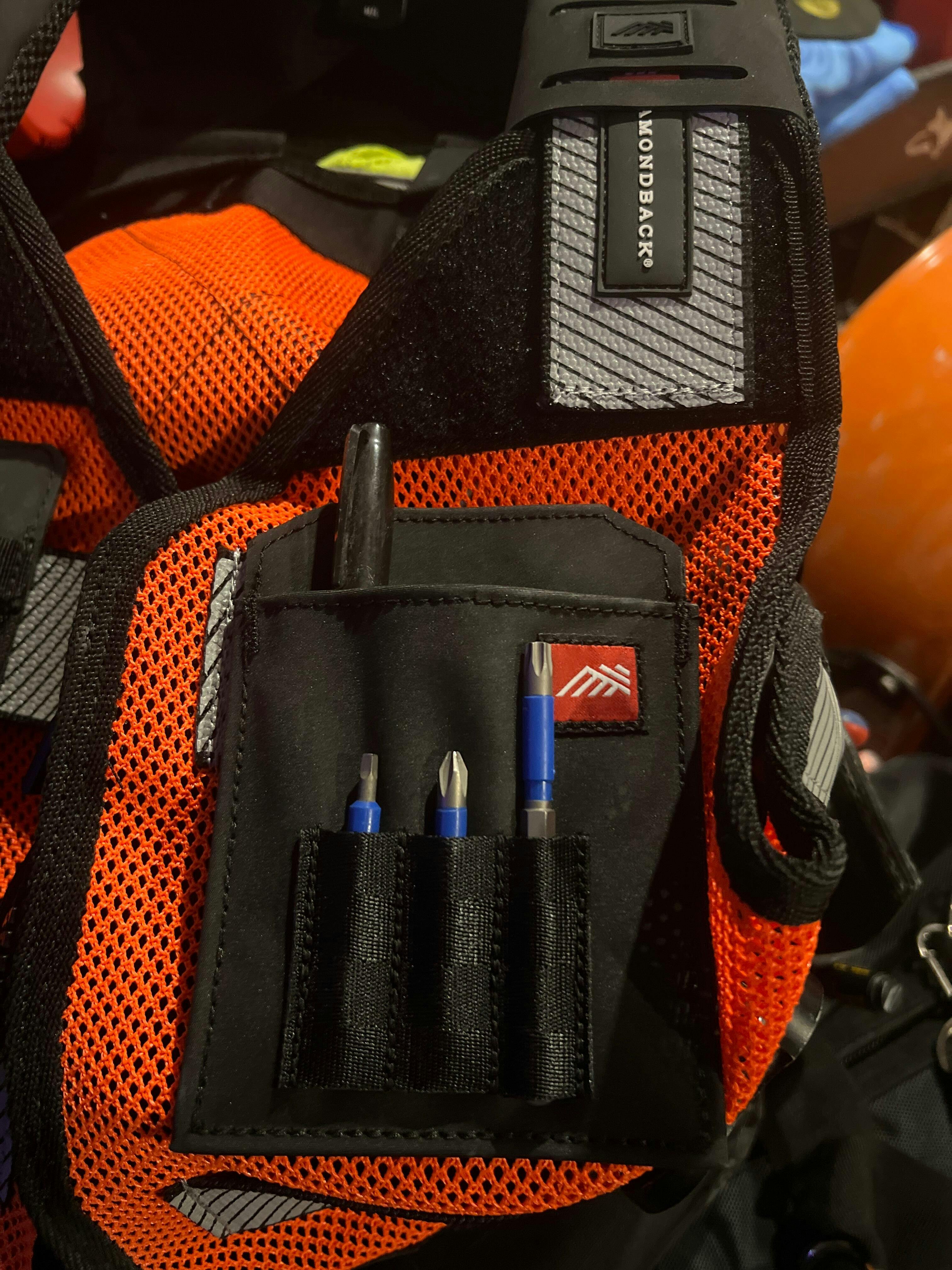 The 716 Utility Pocket comes with a 3.5” large opening perfect for a small notepad, combo square, or small tool. The outside has a 3-slot bit index for you vital, most used bits or drill attachments.